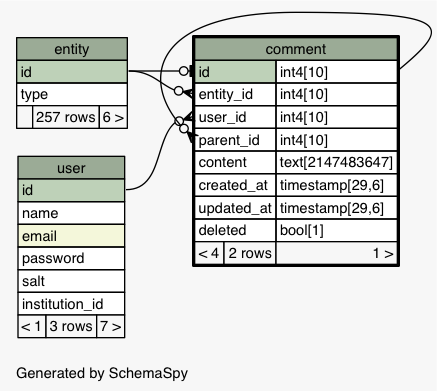 Each entity's identifier column (always named id) is a foreign key to the id column in the entity table. Anytime a new entity is created, a new row in the entity table is created and linked back to the type of class. The type (or discriminator) column of the entity table specifies how the ORM should JOIN the entity table to load it's actual data. For example, take the Question entity which has a type of "question". Any queries related to that entity join onto the question table to return the question data.