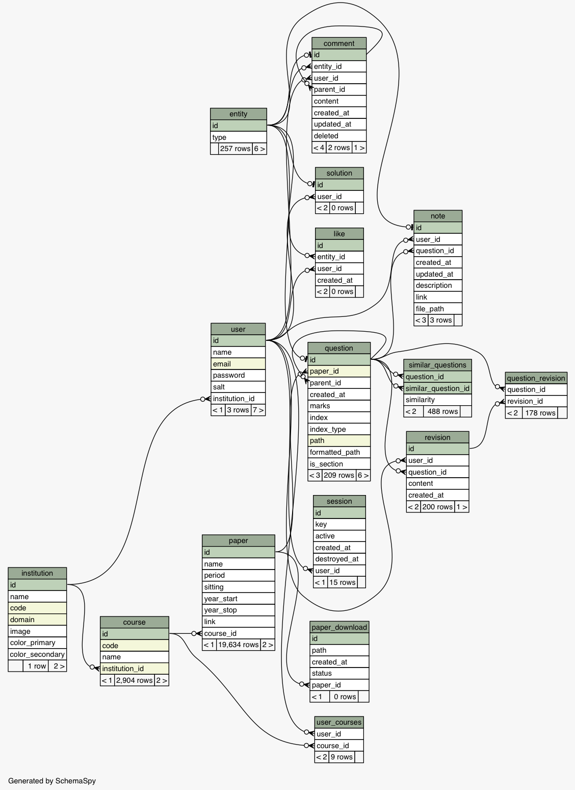 Since the question and solution content is both open to anyone to edit and critical to the experience of the application, it is important to protect the data from abuse. With the manual editor of the exam papers, the contents of the papers are entirely crowd-sourced. As a consequence of crowd-sourcing, there will be users and spammers who will corrupt some valid question data malicious intent. To account for this, the application has implemented a wiki style revision system where any changes to the question or solution content is stored, in its entirety, in the revision table. The revision table has a TEXT column called content which, as labelled, contains the content being stored. To store what is the current revision of the question, a question_revision table maps the question to the current revision.